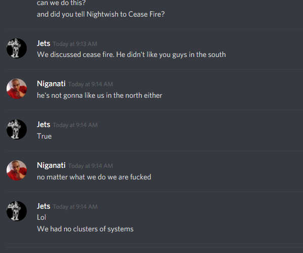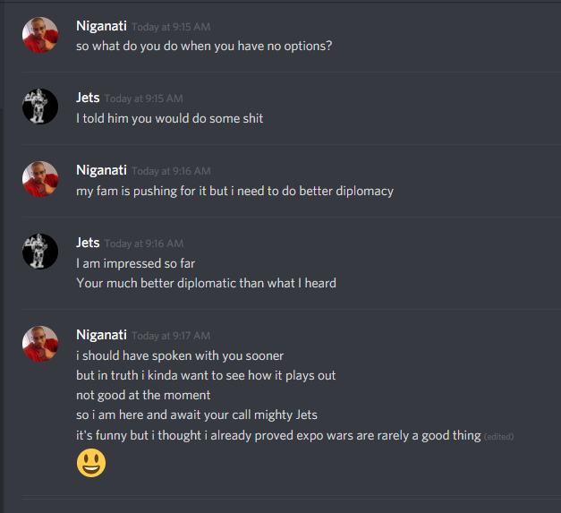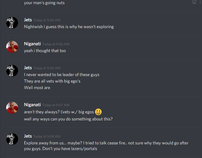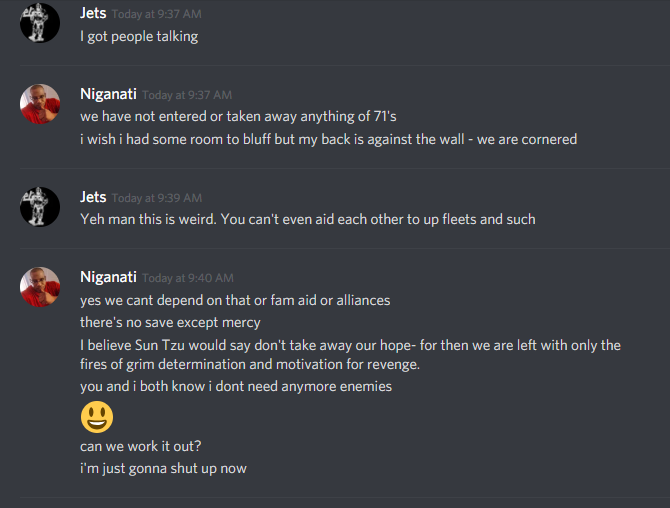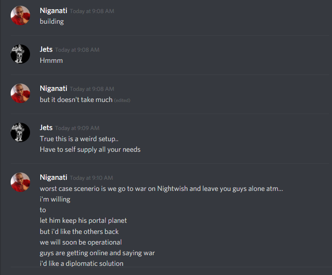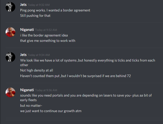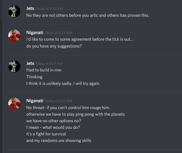 Wow swagga I didn’t see this till now. In future refrain from posting discord conversations from me at least. I am sure others would also agree. No more attacks. I owe my family planets now. Now I might not hit number 1.