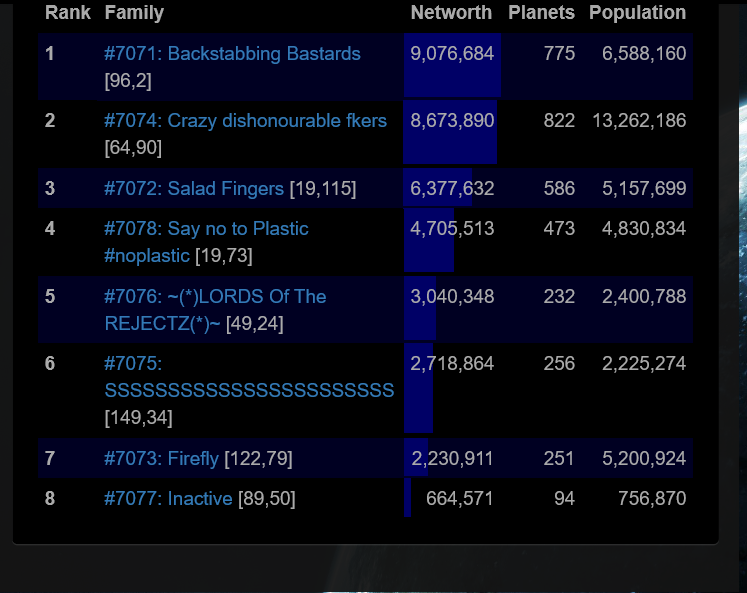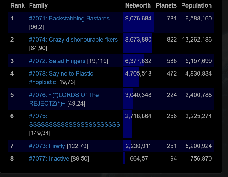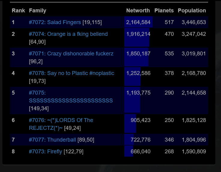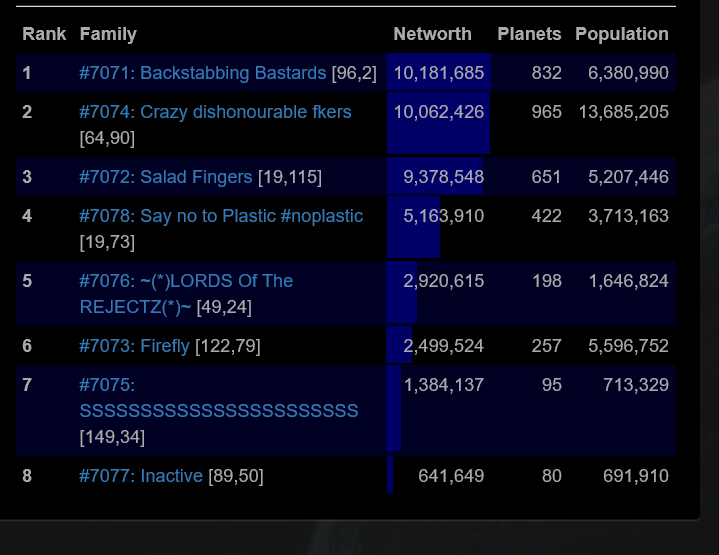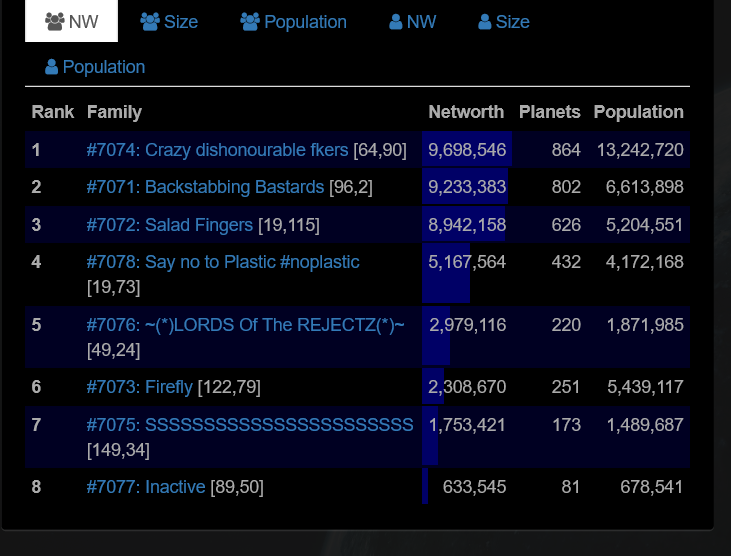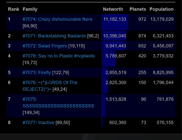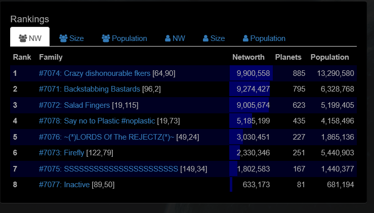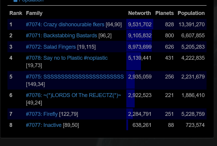 We tried fighting with 71, it was a big stalemate and made family 74 out eco us both. Farming smaller fams is the only way to win size. Putting rules in place that you cant attack families 40% of your NW would really help this.